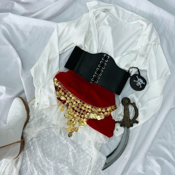 Disfraz pirata (camisa,pollera,pañuelo, cuchillo,parche y corset)